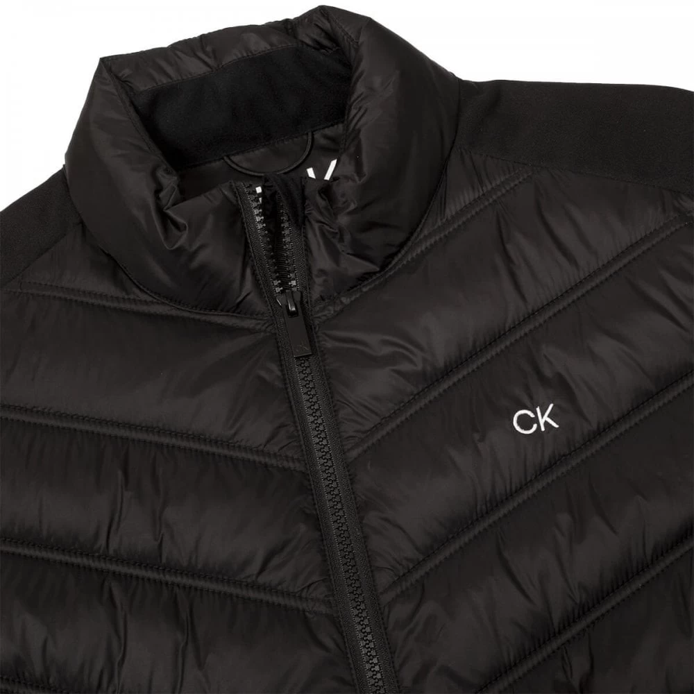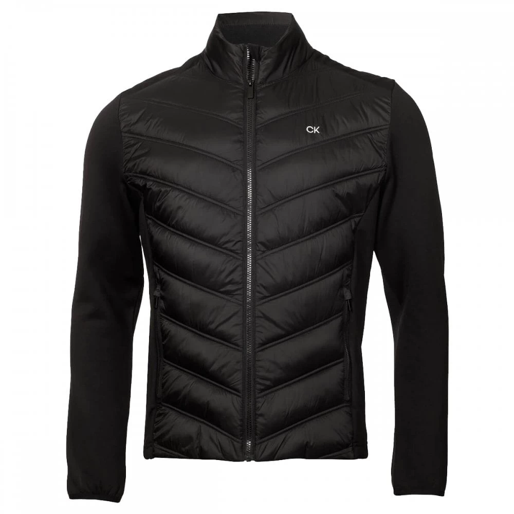 Scoring top marks for style and function the Frontera Hybrid Jacket from Calvin Klein golf is the perfect all-rounder. Enjoy exceptional movement while playing and great protection from the wind and cold with this high performing full zip jacket made from an innovative mix of two fabrics – super soft, high stretch back and sides with a padded nylon front and collar. Two front zippered pockets ensure secure storage.