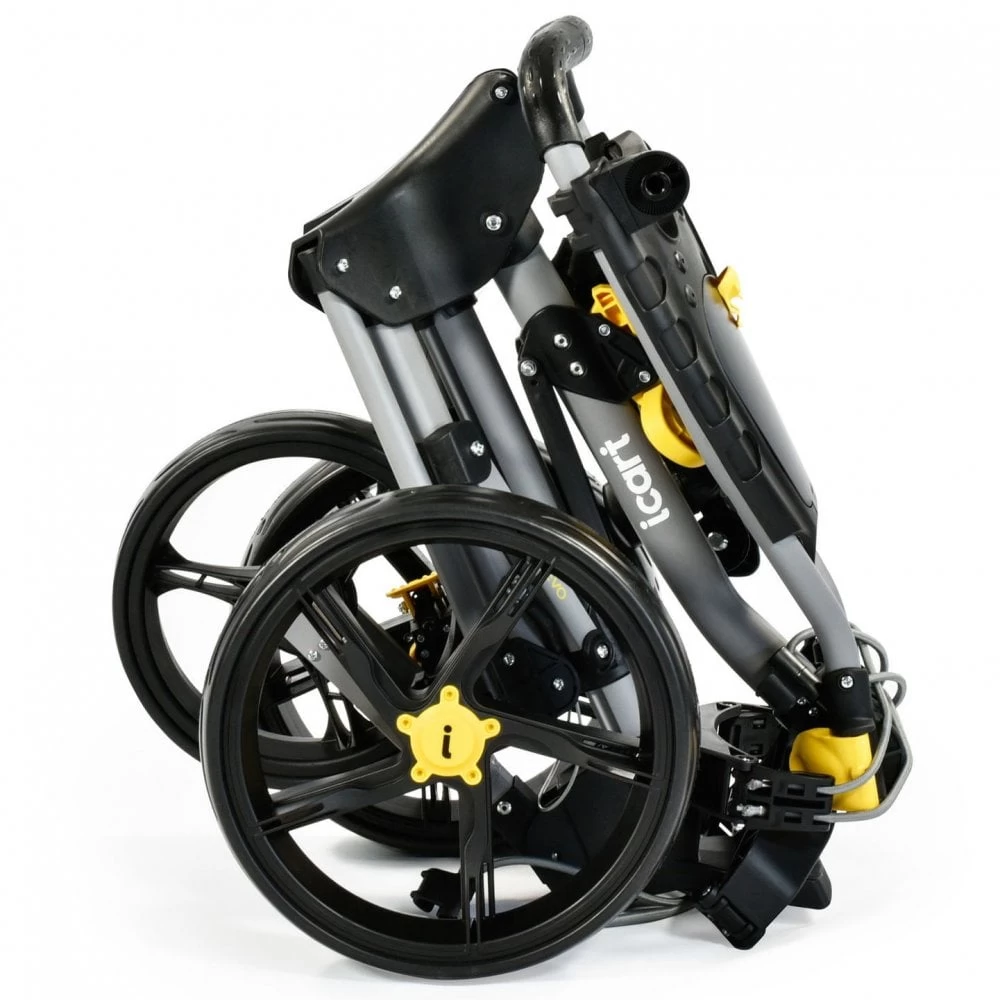 The smallest iCart in the range, the Evo’s fast fold system means the trolley will reduce down quickly to a compact size. Perfect for golfers looking for a high quality push cart but with limited boot space. Universal, adjustable umbrella holder is included with the iCart Evo.